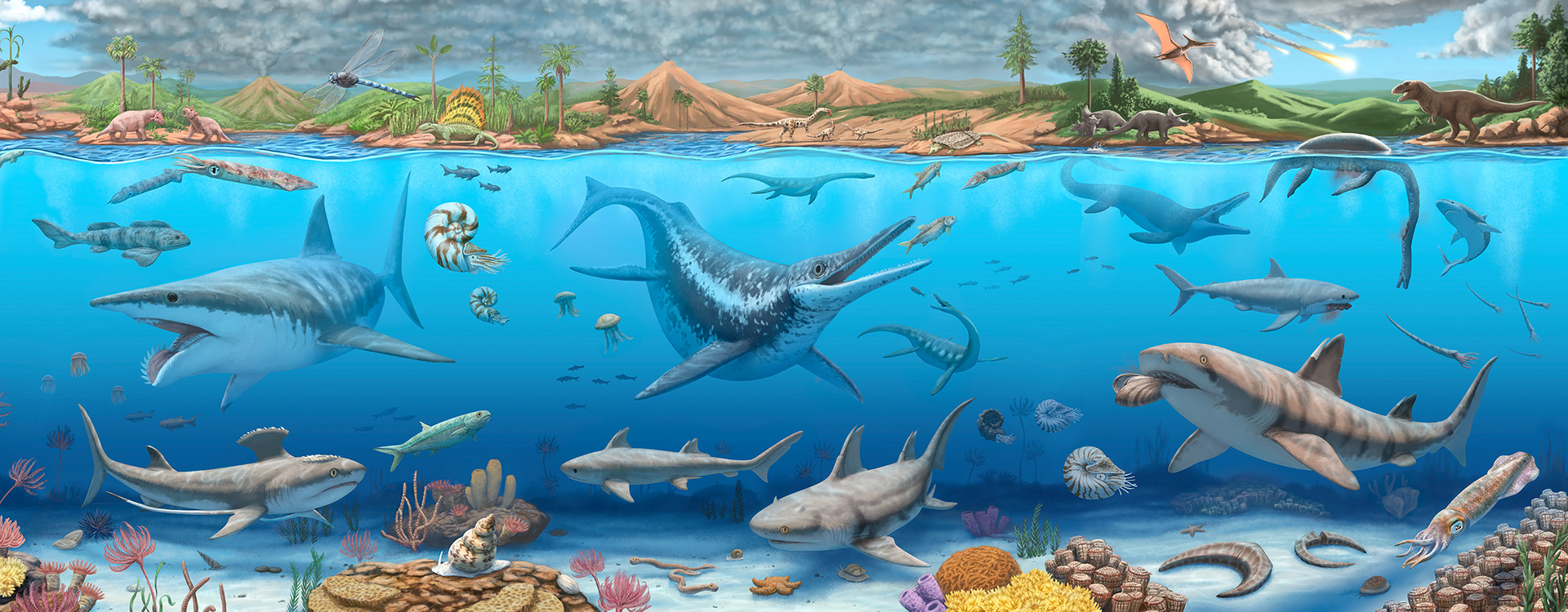 Secondly, I illustrated a series of display panels to portray the evolution of sharks through each of the five mass extinction events. These illustrations tell a story of survival and adaptation, demonstrating the remarkable journey of sharks through hundreds of millions of years of history. The user could manually move a lever to highlight each panel and read more information about how the sharks persevered through each era.